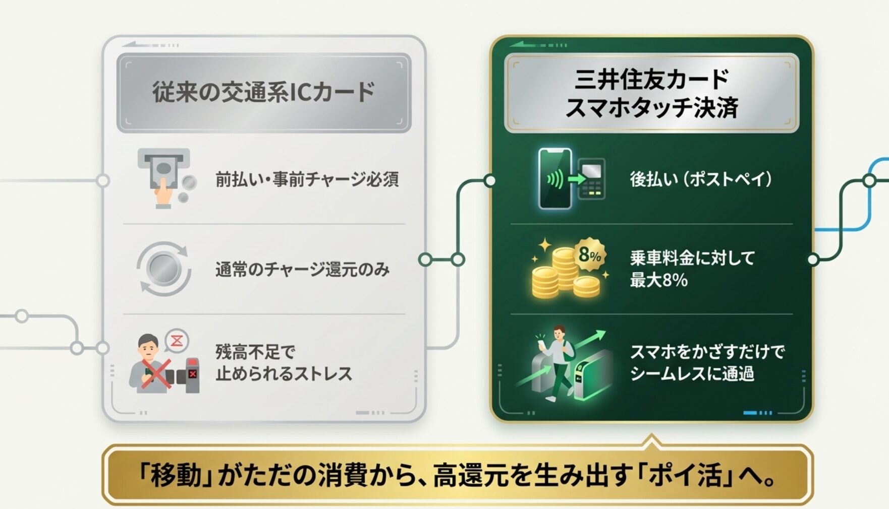 交通系ICカードへのチャージでポイントを貯める時代から、改札にスマホをタッチするだけでダイレクトに高還元を受ける時代へと進化しています。