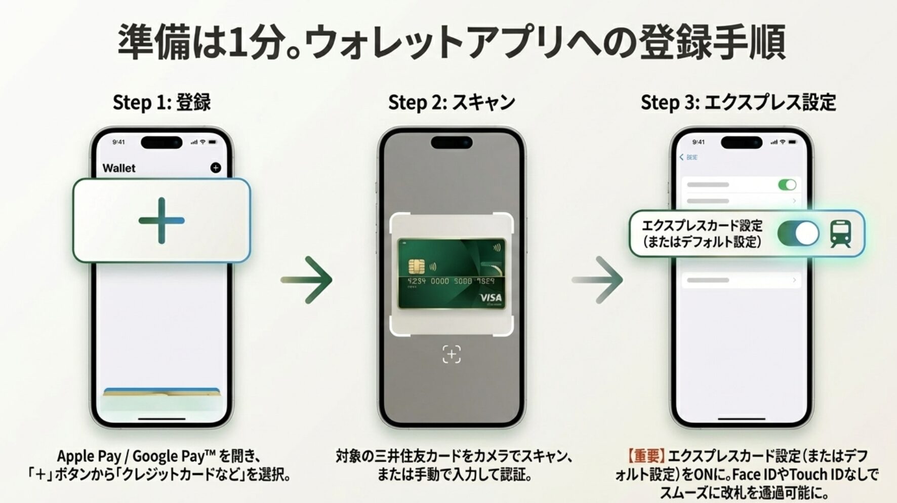 まずは、お手持ちの三井住友カードをスマートフォンのウォレットアプリに登録します。