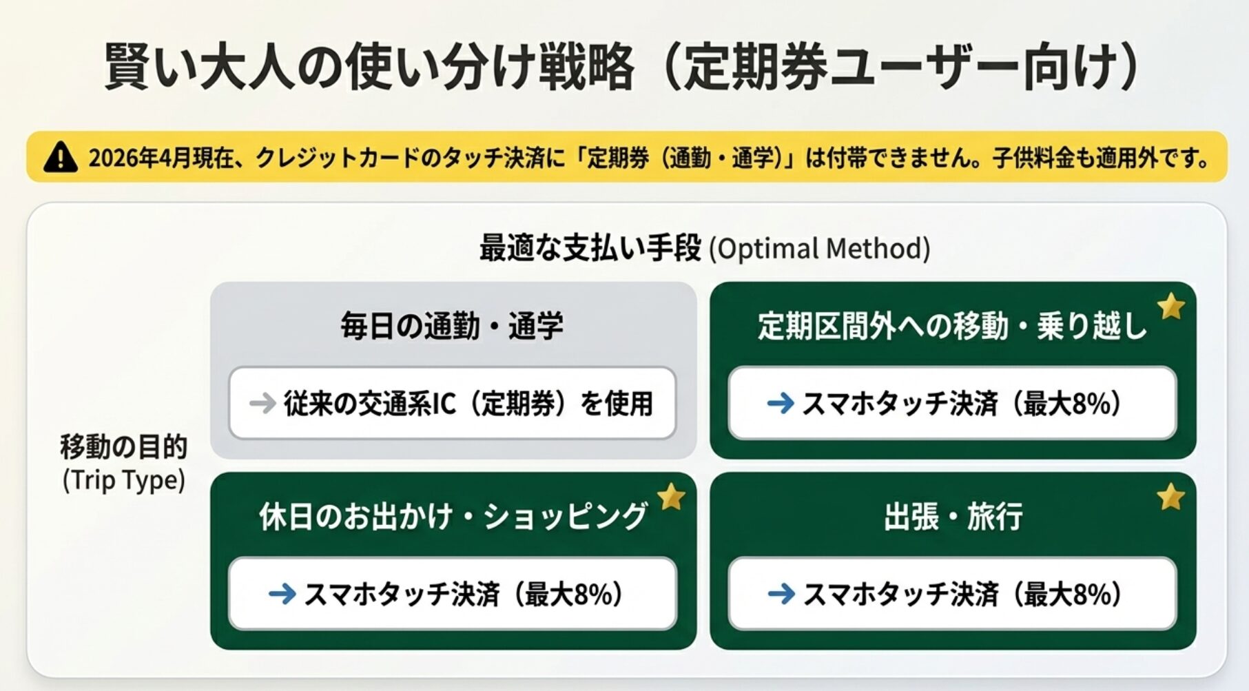 これらを正しく理解して使い分けることで、毎月の移動費から着実にポイントを積み上げることができるでしょう。