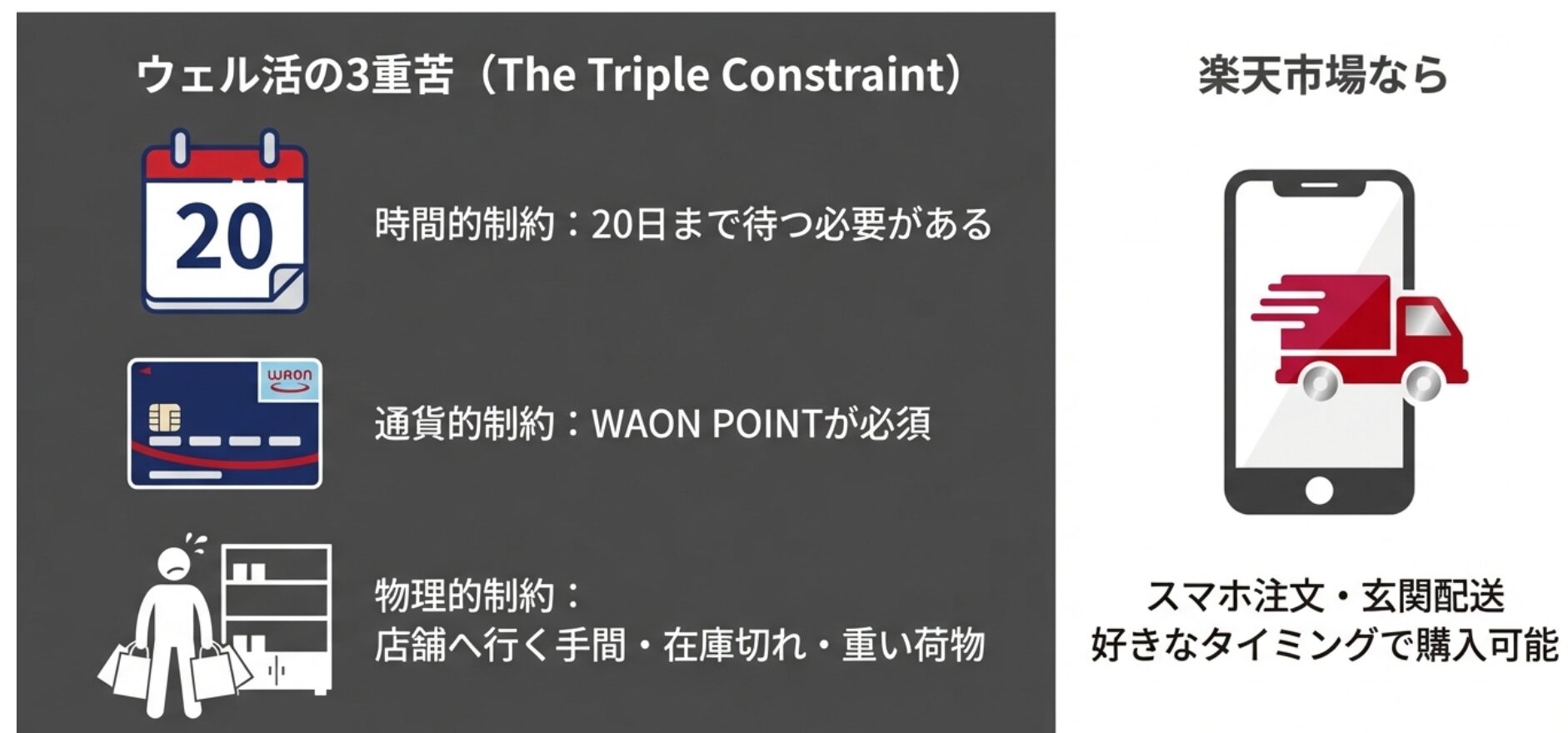 この「20日まで待たなければならない」「特定のポイント(WAON)が必要」「店舗に行く手間」という3重の制約が、忙しい現代人にとって「楽天市場で買ったほうが楽で早い」という判断に繋がっています。