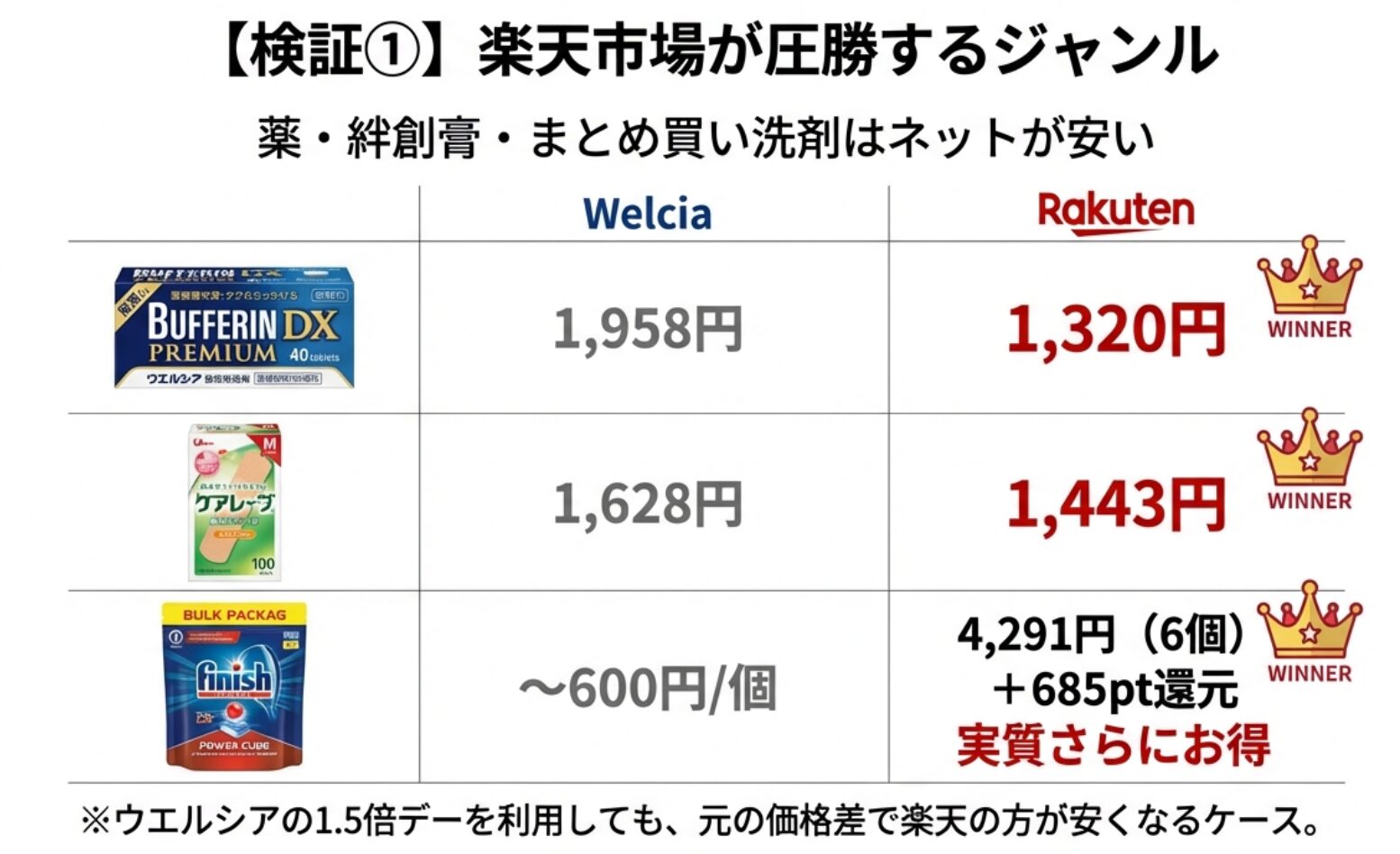 このように商品ごとでウエルシアで買うべきか、楽天市場で買うべきか、お得度の違いが分かると思います。