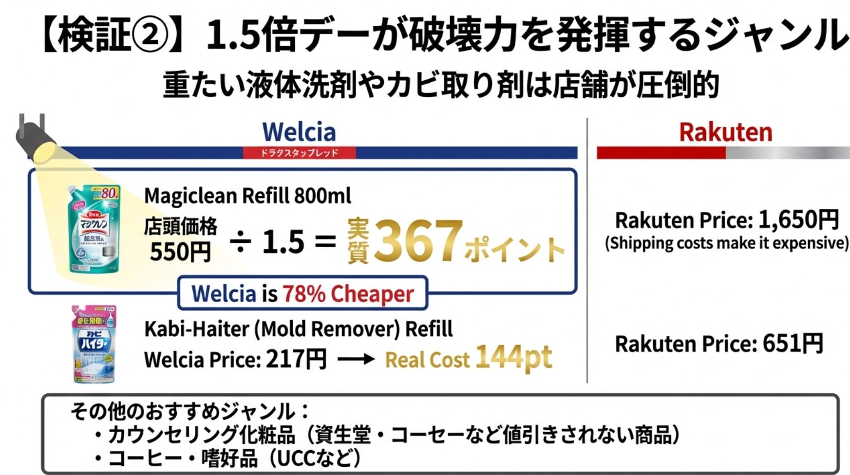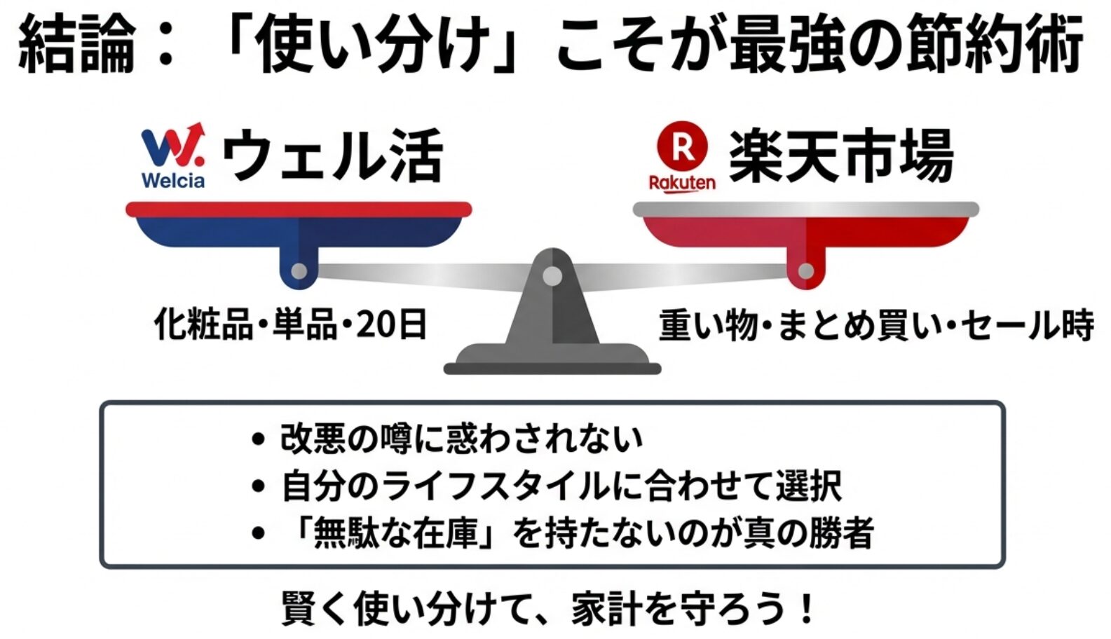 「1点あたりの価格差」が少ないものはウェル活、「まとめ買いで安くなる消耗品」は楽天市場、と使い分けるのが最も賢いポイ活術です。