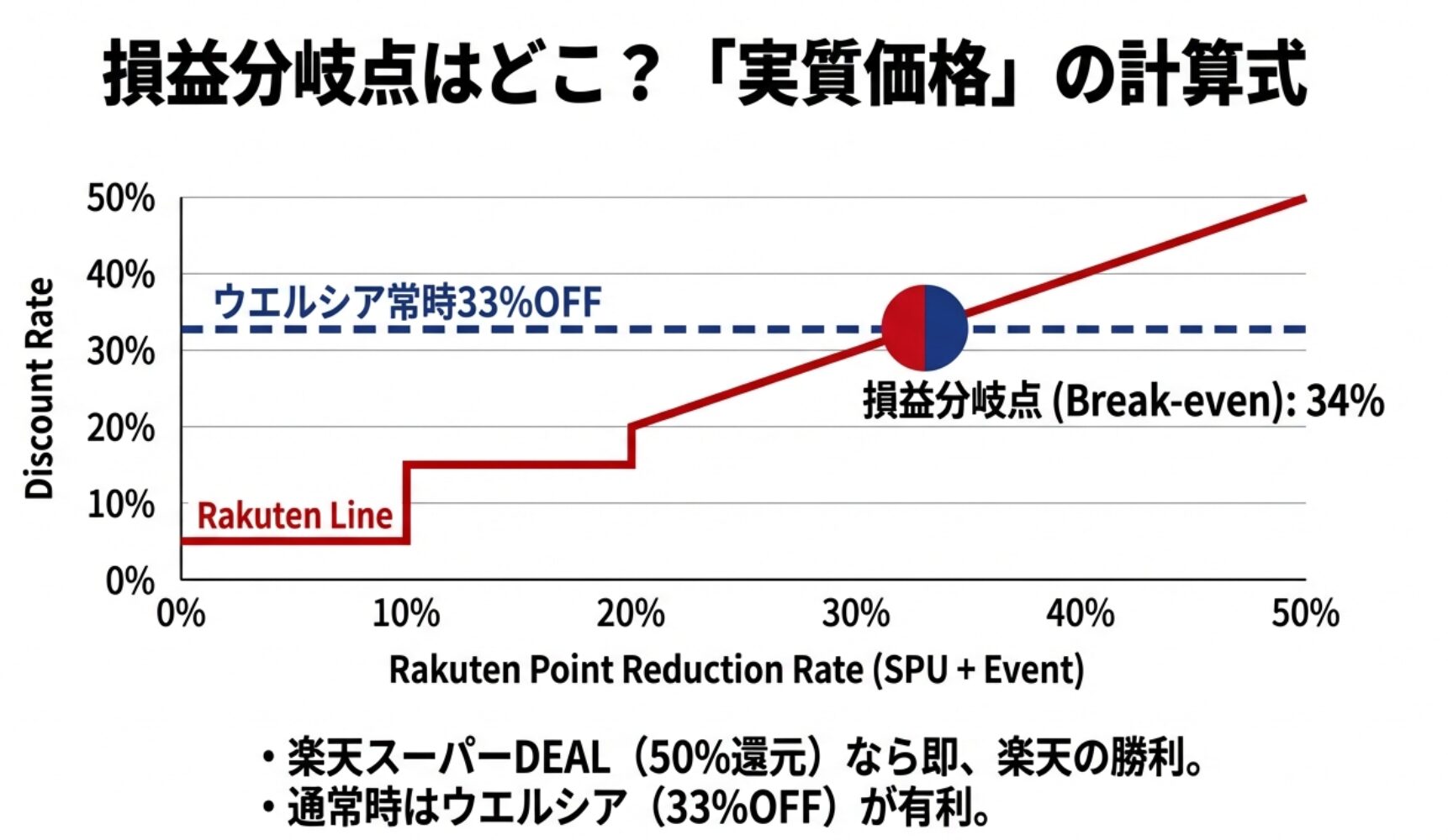- ポイント還元率が34%を超える: 買い回り+SPU+各種キャンペーンで、実質価格がウェル活を下回ります。