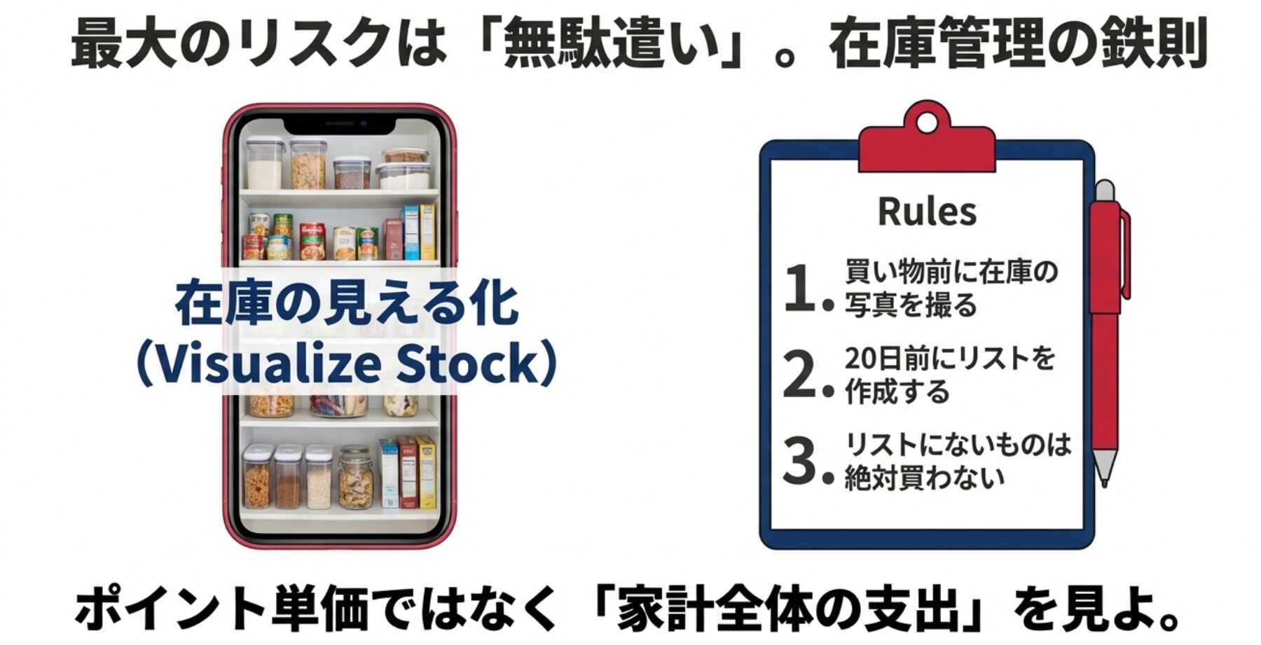 ポイント還元率が高くても、使いきれずに期限が切れる商品を買っては本末転倒です。「本当に今、必要なのか?」をリストと照らし合わせる習慣が、最強の節約術になります。