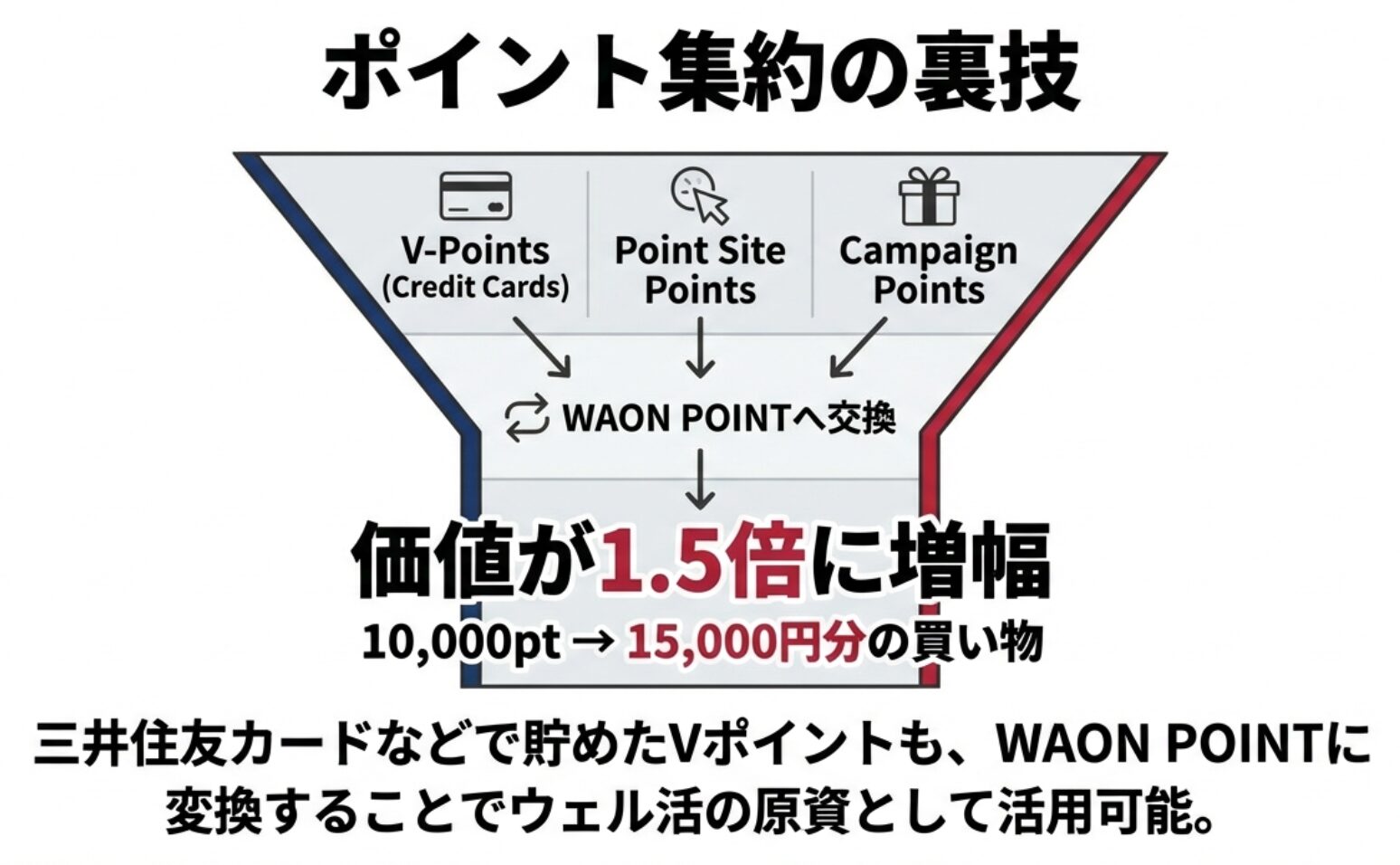 これにより、普段の買い物以外で貯まったポイントを「ウェル活の1.5倍」として利用でき、実質的な手出しをゼロに近づけることができます。