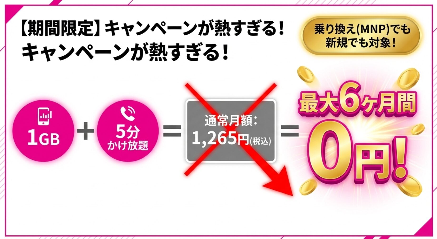 現在、「1GB+5分かけ放題プラン」が半年間実質無料という、通信業界を震撼させるキャンペーンが実施されています。