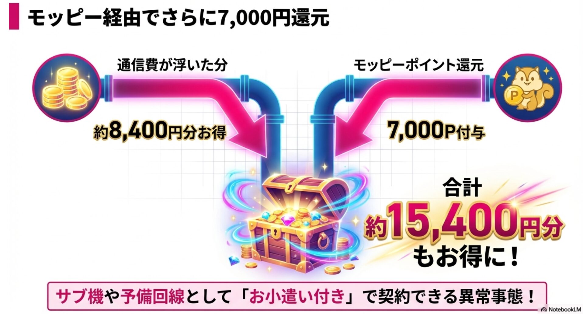 キャンペーンはこれだけではありません。ポイントサイト「モッピー」を経由して申し込むことで、7,000円相当のモッピーポイントが付与されます。