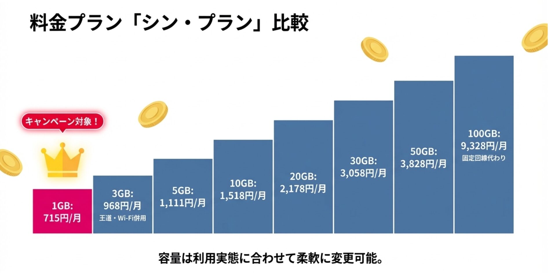 そのノウハウを活かし、スマホプラン(シン・プラン)においても、ユーザーの利用実態に合わせた柔軟なギガ選択が可能です。
