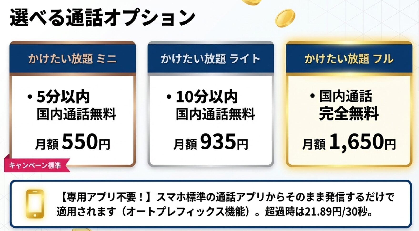 また、シン・プランは標準で「5分かけ放題」が含まれていることが多いですが、さらに長電話をする方には「フルかけ放題」へのアップグレードも可能です。