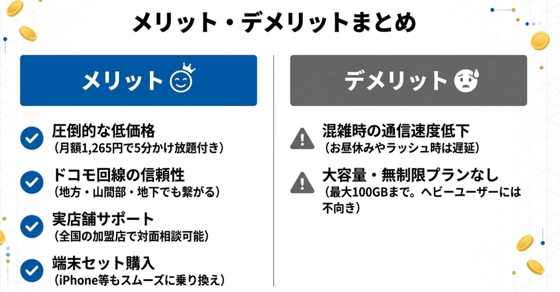 - 圧倒的な低価格: 1,265円で5分かけ放題付きは業界最安級。